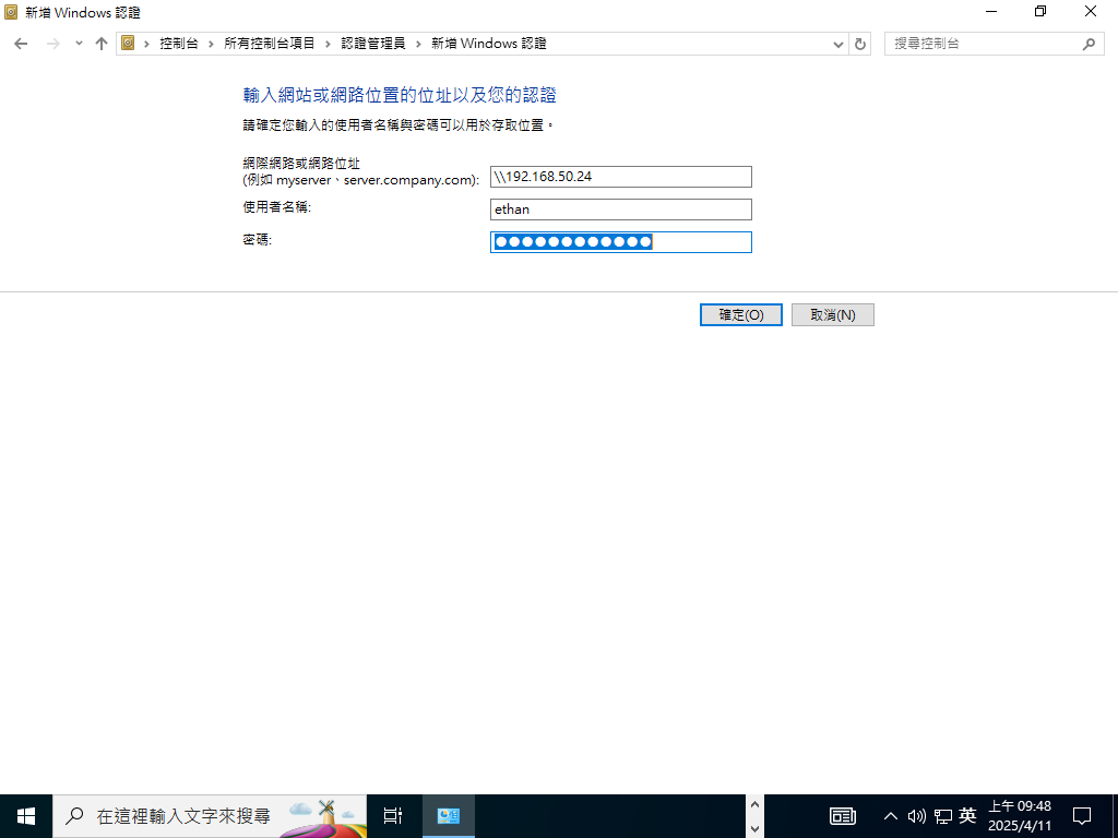 若上述方法無效,可嘗試另一個方法 “Windows 憑證”,在(控制台) 點選 ( Windows 認證)→新增,(Windows 10 連至 Windows 11 的 EPSON L360 測試有效 2025-04-11)