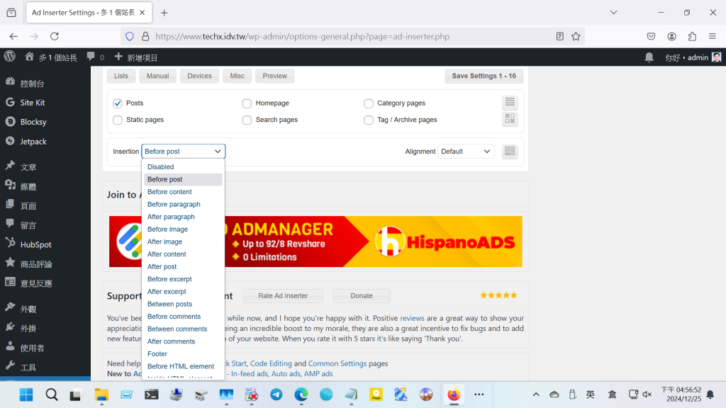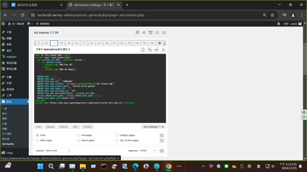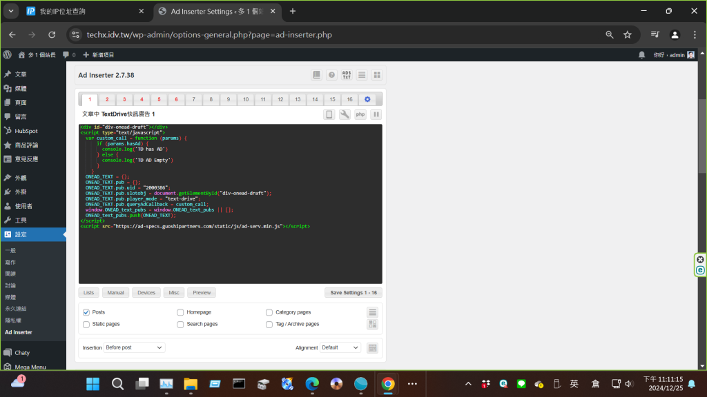 安裝完成後,您需要配置 Ad Inserter 外掛,以便在網站上插入廣告代碼:
