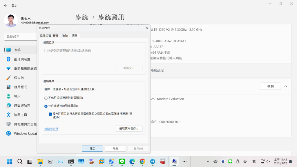 • 在「遠端」標籤下 → 選擇「允許遠端連線到此電腦」。