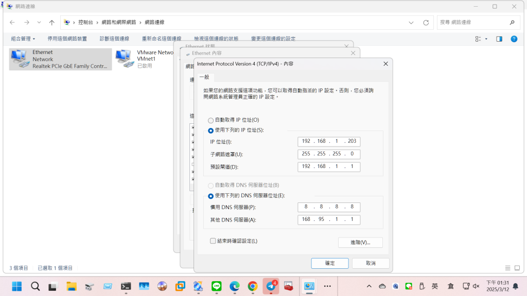 • 確認伺服器區域網路手動 IP 為 192.168.1.203