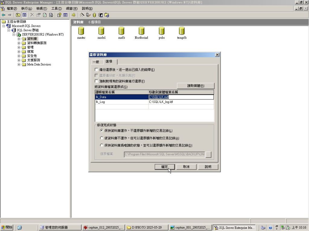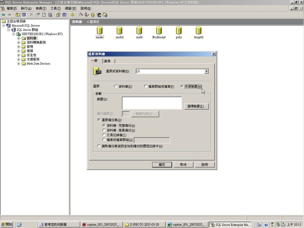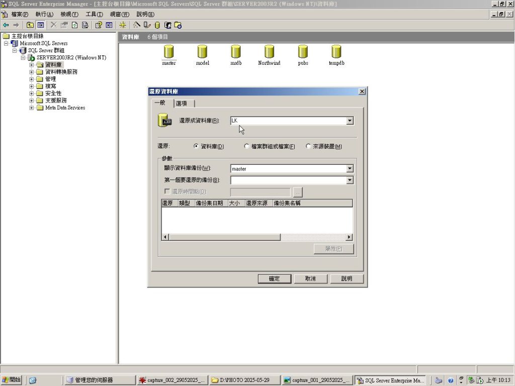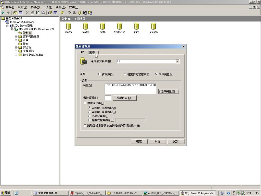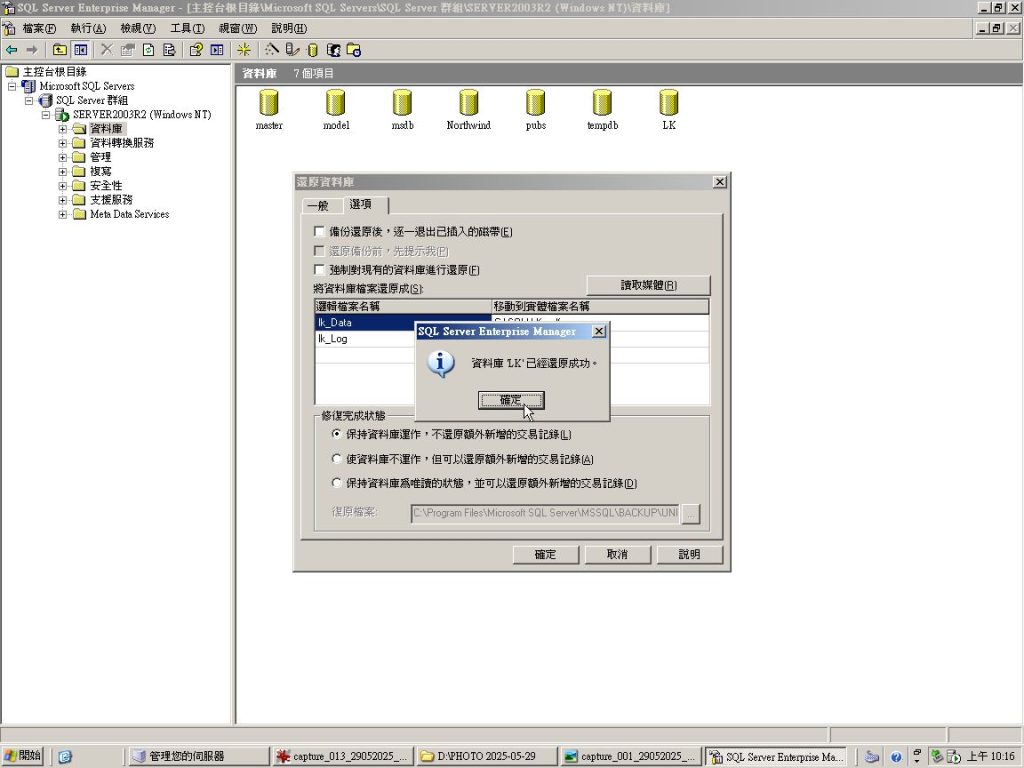 在 SQL Server Enterprise Manager 版本 8.0 中,資料庫(如本例 “LK” ) 還原操作與後續版本有些許不同,以下是一些流程,用來還原 [ LK ] 資料庫: