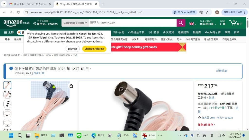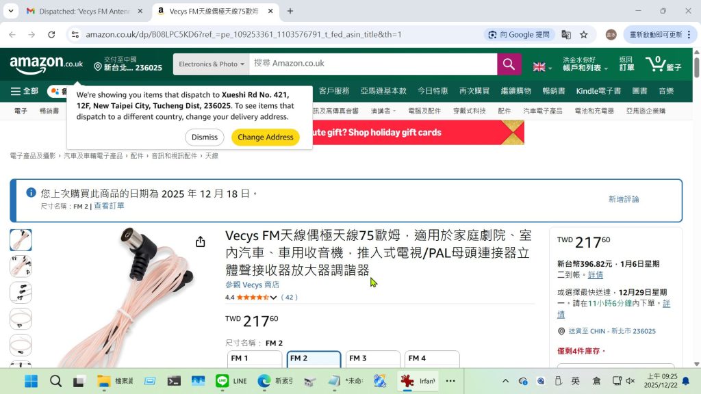 Amazon 網購之 Vecys FM 偶極天線 75 歐姆母頭實拍,管徑略大於 USHER T-6 機器端公頭,以完美結合( 2025-12-28 確認無誤,没買錯 )